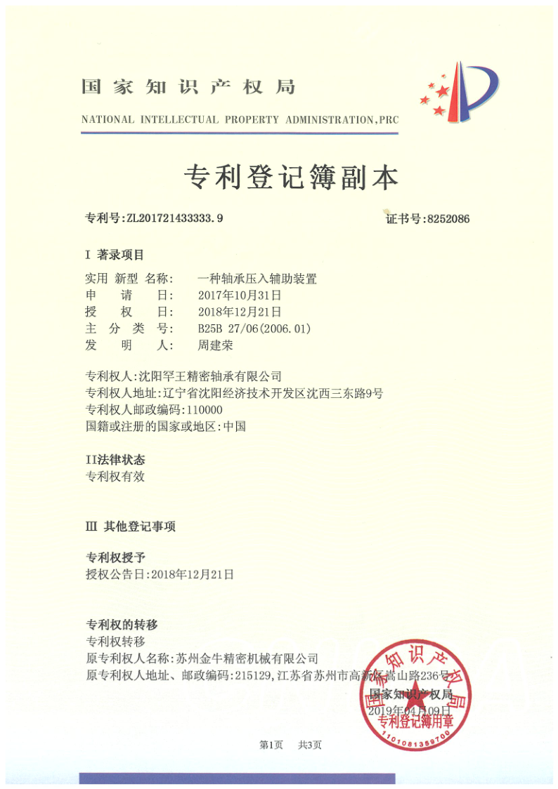 转让专利 一种轴承压入辅助装置